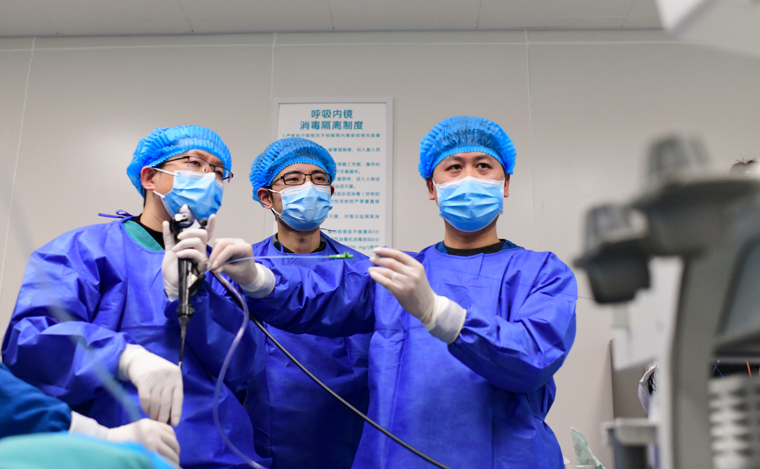 患者唐先生,68岁,因“反复咳嗽1年,呼吸困难1周”来我院诊疗,曾在我院呼吸与危重症医学科明确诊断为肺鳞癌 ⅣA期,诊断明确后,先后行化疗及PD-1单抗免疫治疗。一周前,唐先生出现呼吸困难加重再次来我院就诊,在为该患者行支气管镜检查后,发现其气管下端新生物堵塞管腔约90%,左主支气管完全堵塞。呼吸与危重症医学科结合病人体征特点,并与患者家属进行充分沟通后,于1月16日对唐先生进行电子支气管镜介入Nd∶YAG激光消融术治疗,并结合圈套器、氩气刀、冷冻切除等技术。最终,堵塞气管及左主支气管的肿瘤被清除,管腔明显通畅,患者呼吸困难症状消失。