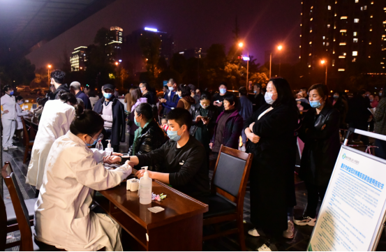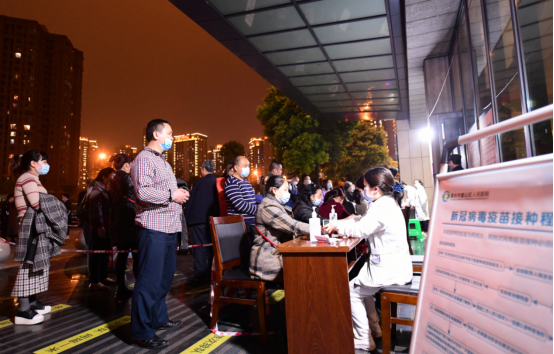 25日璧山区人民医院原定接种任务为1100支新冠疫苗,至傍晚时再追加600支。为高效完成接种任务,保障市民顺利成功接种,璧山区人民医院在门诊处搭起了临时接种点,医护人员们加人、加班、加点为市民接种新冠疫苗,确保接种任务的完成。