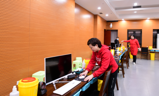 考虑到市民接种量需求逐日增加,区人民医院将101及102会议室设置为临时接种点,信息科、后勤保障部及其他科室志愿者集体出动,利用夜晚时间为60台电脑布置网络并接入疫苗接种系统,严格按照流程规范布置场地,保证接种点能顺利运行。
