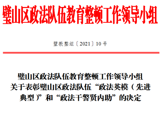 近日,为表彰先进、弘扬正气、树立典型,璧山区政法队伍育整顿工作领导小组对默默在背后无私奉献的政法队伍家属们进行了表彰。我院职工赵春迪、张权获得了“政法干警贤内助”荣誉称号。