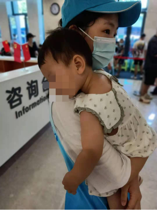 7月24日,在医院科教楼的疫苗接种点内,一位独自带着宝宝来接种新冠疫苗的妈妈,因为要排队,而抱着宝宝又十分辛苦,志愿者看到后主动上前问其是否需要帮助,那位妈妈了解志愿者信息后,也非常信任地把宝宝交给咱们志愿者暂时照看,宝宝也非常配合地乖乖趴在志愿者姐姐肩上,睡得香甜。
