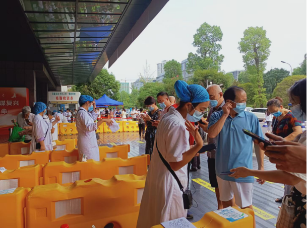 8月初,江津双福地区出现确诊病例,新冠核酸检测需求量激增,医院迅速反应重启“愿检尽检核酸采集点”,在院外安置核酸采集屋,运行集挂号、缴费、核酸采集、报告打印一体的模式,为患者节约时间精力的同时降到疫情传播的风险,志愿者冲锋在前,承担着分流中高风险返渝人员,维持排队秩序保持人群一米间距,指导患者自助机或移动端挂号缴费等任务。疫情当前,他们从不畏惧,做好自身防护的同时耐心地向患者讲解。