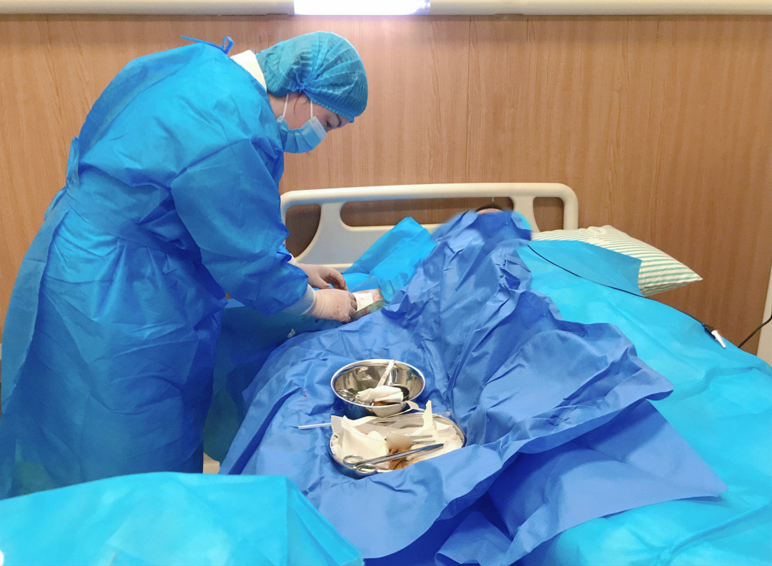 肿瘤血液科经过与徐阿姨及家属的充分沟通,最终决定为患者置入手臂输液港。手术先由置管护士在超声引导下结合腔内心电技术置入导管,确定尖端位置;再由魏漫副主任在穿刺点下方进行囊袋的制作,最后置入港体及缝合。整个术程中,医护团队配合默契,为患者成功置入了手臂输液港。术后徐阿姨表示基本不怎么疼痛,回到家也不用担心生活不方便了。