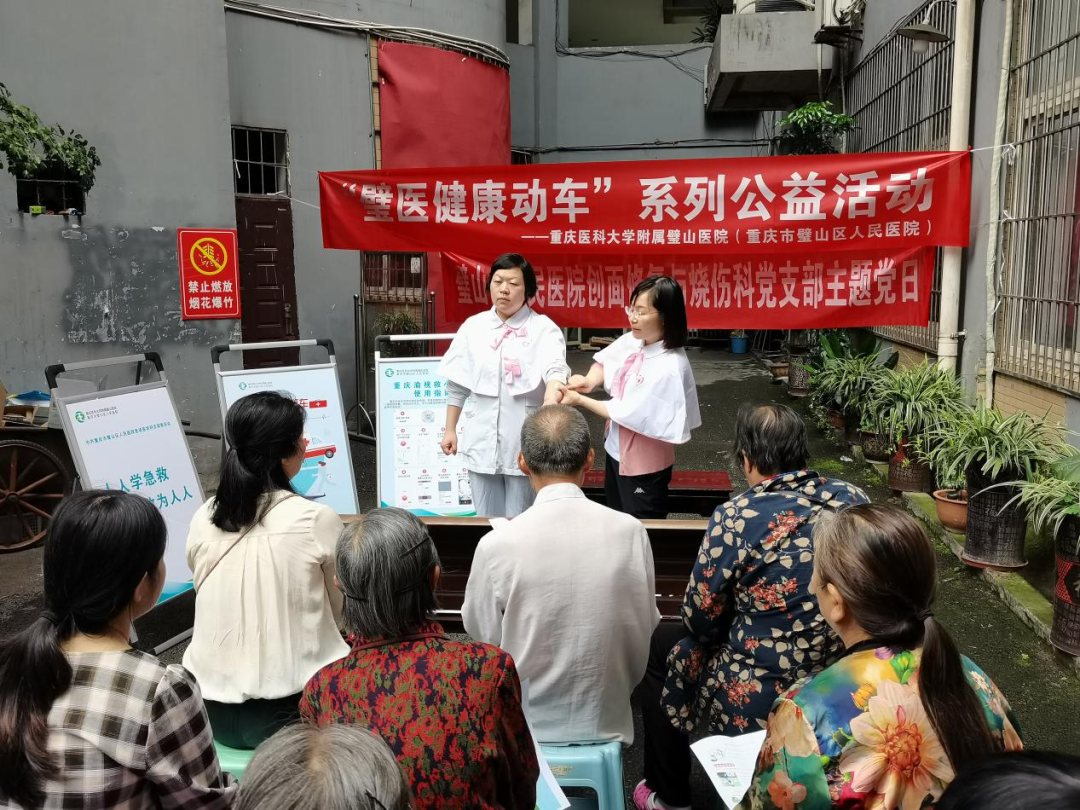 同一天,我院创面修复与烧伤科党支部联合急诊医学科党支部,走进区疾控中心家属院,开展了义诊科普活动。活动现场,院前急诊医生黄波为现场群众详细讲解了“渝视救”120报警小程序的使用方法;创面修复与烧伤科党支部书记徐兰向居民演示了气道梗阻的急救方法、讲解了蛇咬伤的预防及处理;志愿者们还为小区居民测量血压、血糖、发放健康资料等。该活动丰富了小区居民的健康知识储备以及提升了大家应对突发状况的处置能力,深受居民们的好评。
