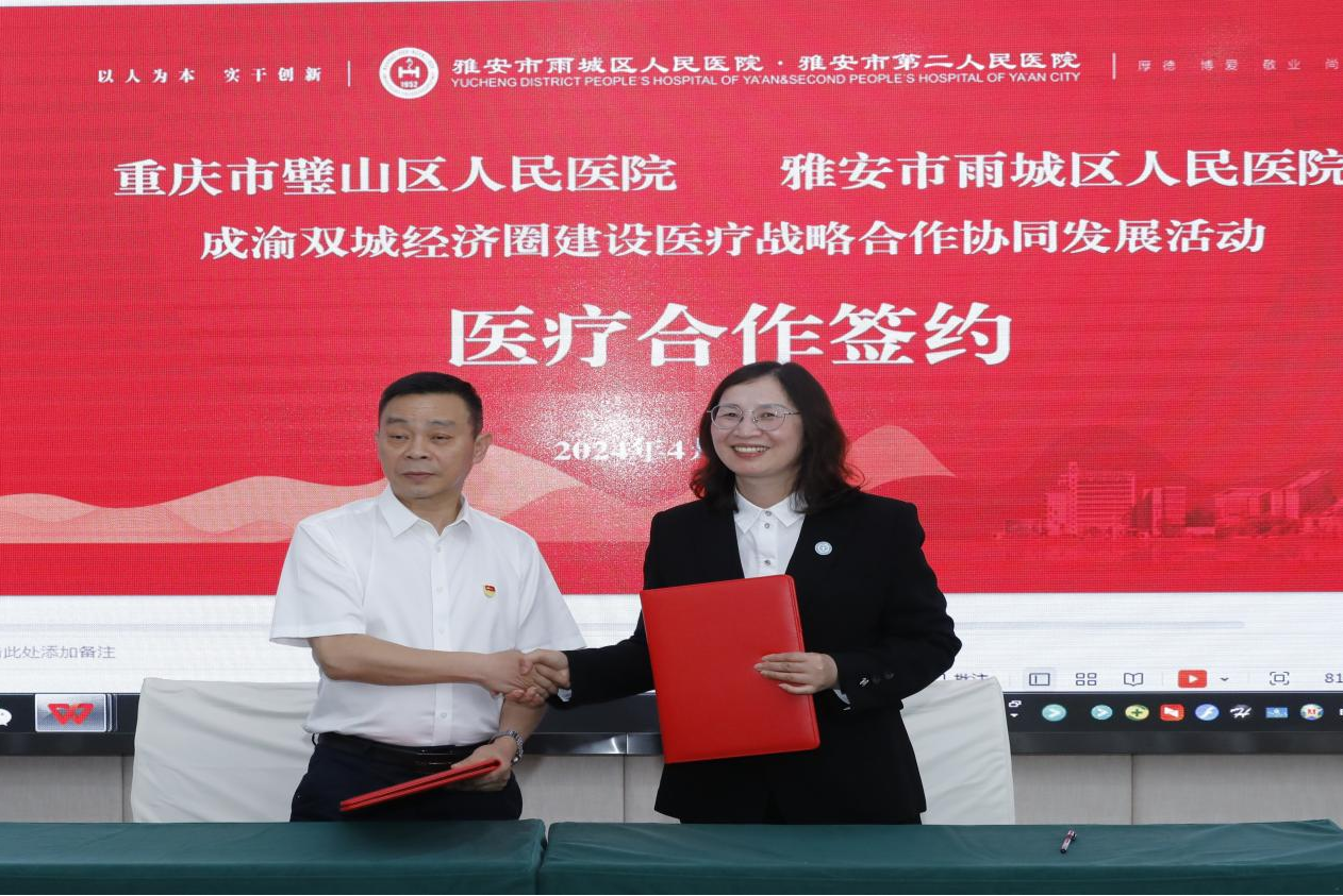 接下来,重医附属璧山医院将以此为契机,与雨城区人民医院兄弟同心、携手并进,充分发挥两院在医疗优质资源方面的优势,深入推动在现代医院管理、医疗技术提升、人才团队培养、学科能力建设、医康养共建协作等领域的全方位深度合作,唱好“双城记”,建好“健康圈”,为两地卫生健康事业高质量发展增砖添瓦、为两地人民群众健康福祉增色添彩。