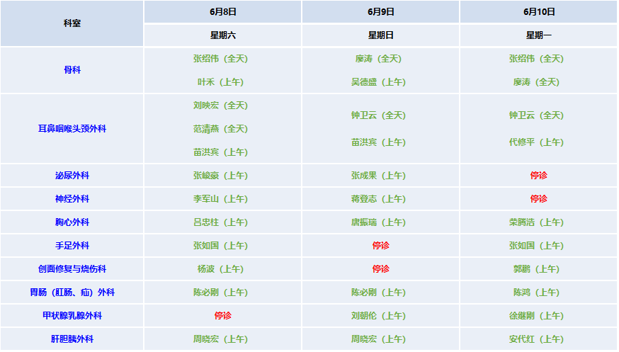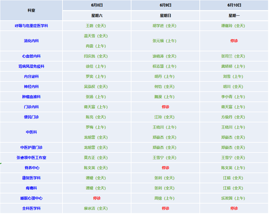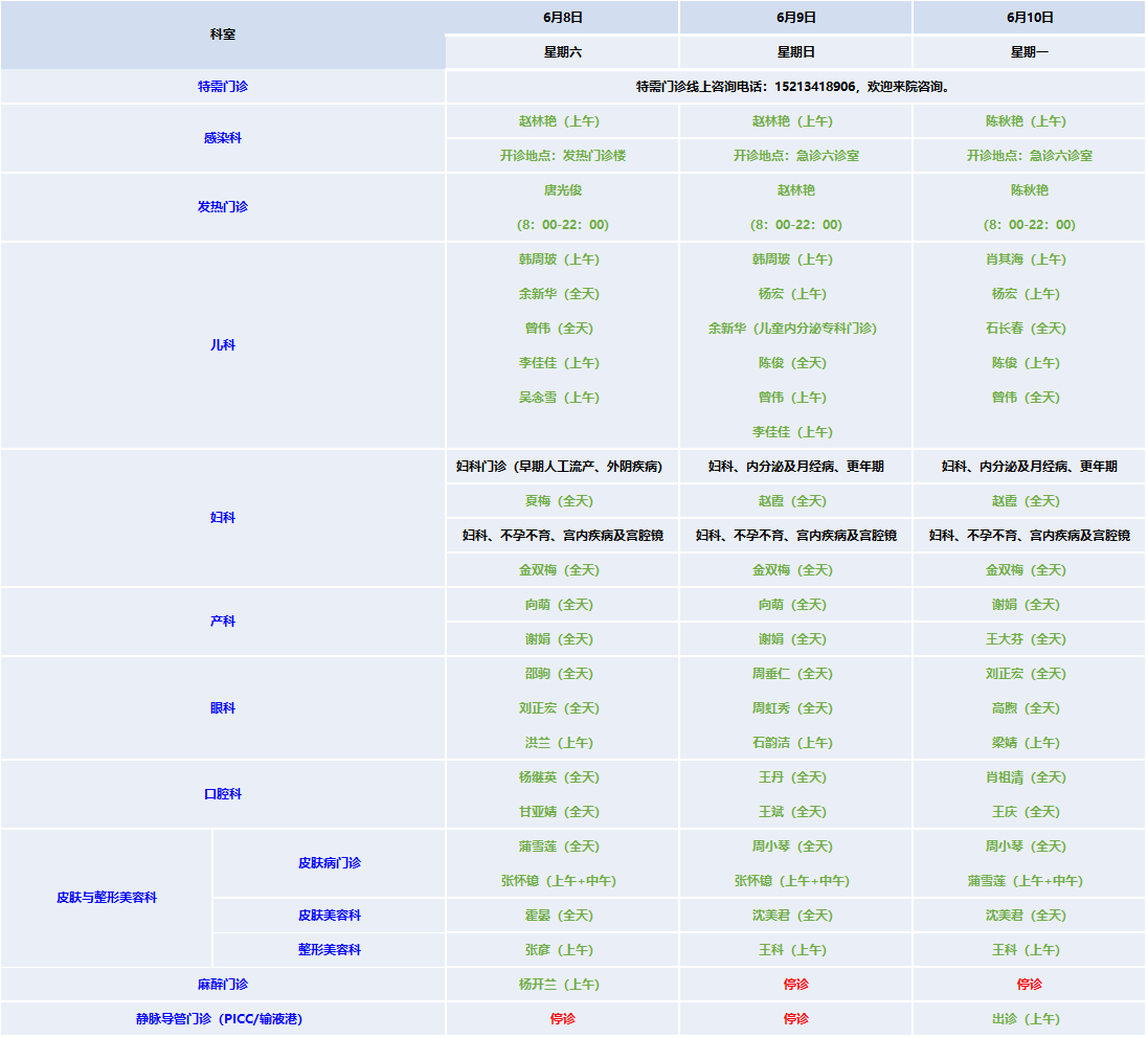 根据国务院办公厅2024年端午假期安排的通知,结合我院实际情况,2024年6月8日至2024年6月10日端午期间我院所有门诊按节假日门诊进行,出诊时间为上午8:00-12:00,下午14:30-17:30;具体出诊安排如下: