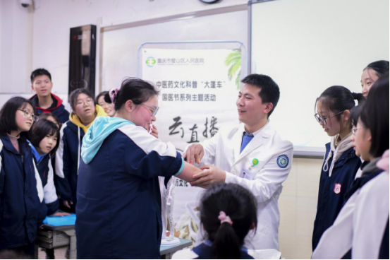 近日,在国医节到来之际,重庆市璧山区人民医院组织中医专家团队,为辖区企业、中小学校、老年社区等群众,开展中医药文化科普“大篷车”系列活动,通过线下体验与线上直播的形式,传播针灸、火罐、艾灸、耳穴等传统中医治疗方法,让群众感受传统中医文化的魅力。
