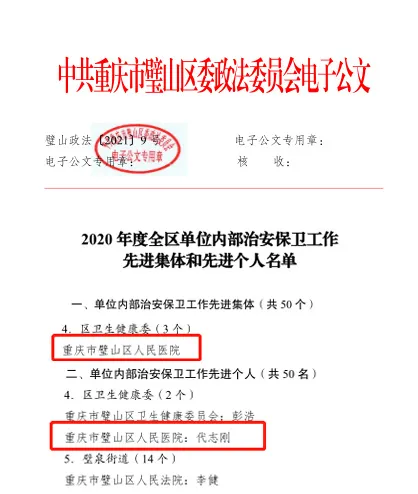 近日,中共重庆市璧山区委政法委员会、重庆市璧山区公安局联合授予我院“2020年度全区单位内部治安保卫工作先进集体”,“2020年度全区单位内部治安保卫工作先进个人”称号。