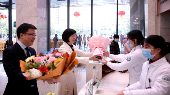 党委书记刘鸿(右一)为咨询台护士送上鲜花及节日祝福。 党委副书记、院长朱堂棋为门诊药房工作人员送去鲜花。 工作人员为奋斗在一线岗位上的女神们送上节日鲜花。 妇产科举行“孕见窈窕女神”活动,妇产科陶才莉主任和罗世利护士长带领孕妈们在轻松愉快的氛围里学习健康知识。 药学部面向医技科室的女职工举办了“三月女人天,靓丽伊人节”主题活动,让大家在精彩有趣的活动中感受运动的快乐。 妇产科陶才莉主任为有友食品股份有限公司的女性职工开展了“宫颈癌早诊早治”健康知识讲座,并现场演示了一套专为女性编排的“女性专属健身操”,帮助大家缓解疲劳。 眼科男同胞手捧康乃馨,为眼科所有的女性医务人员献上真挚祝福。