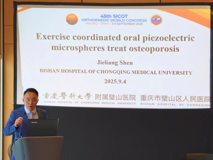 2025年9月3日至5日,由国际矫形骨科及创伤协会(International Society of Orthopaedic Surgery and Traumatology, SICOT)主办的第45届SICOT世界骨科大会(Orthopaedic World Congress, OWC)在西班牙首都马德里隆重召开。重庆医科大学附属璧山医院康复医学科、疼痛科主任沈皆亮受邀参会,并在大会上进行了“Exercise coordinated oral piezoelectric microspheres treat osteoporosis(运动结合口服压电微球治疗骨质疏松症)”的学术发言,在国际舞台上展示了我院骨质疏松领域的研究成果。