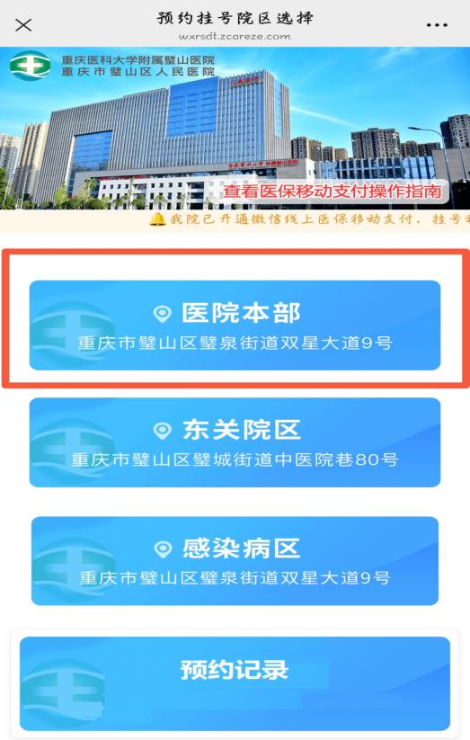 关注“重庆市璧山区人民医院”微信公众号,点击左下方“导诊”中的“预约挂号”,跳转页面