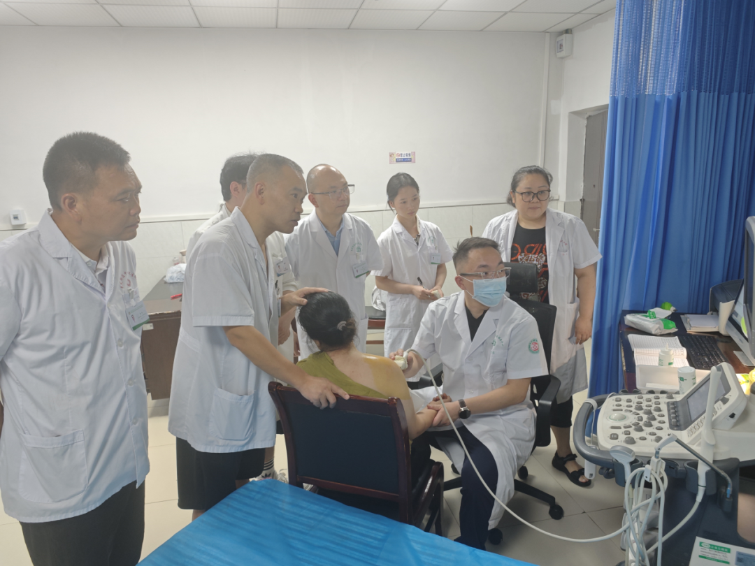 授课现场气氛热烈,来凤医院医护人员积极互动,围绕社区患者诊断、慢病管理、科学用药和用药依从性提升等实际问题展开深入讨论。沈皆亮走进中医科门诊,为一例顽固性肩周炎疼痛患者进行会诊,运用超声引导下关节腔注射技术为患者治疗,通过实时动态影像精准定位病灶完成药物注射。这项技术能有效避免传统盲穿的风险,显著提高治疗的安全性和有效性。操作过程中,沈皆亮一边施术,一边细致讲解进针角度、药物配比及并发症预防要点,“全程无痛,做完治疗后肩膀就能活动了!”